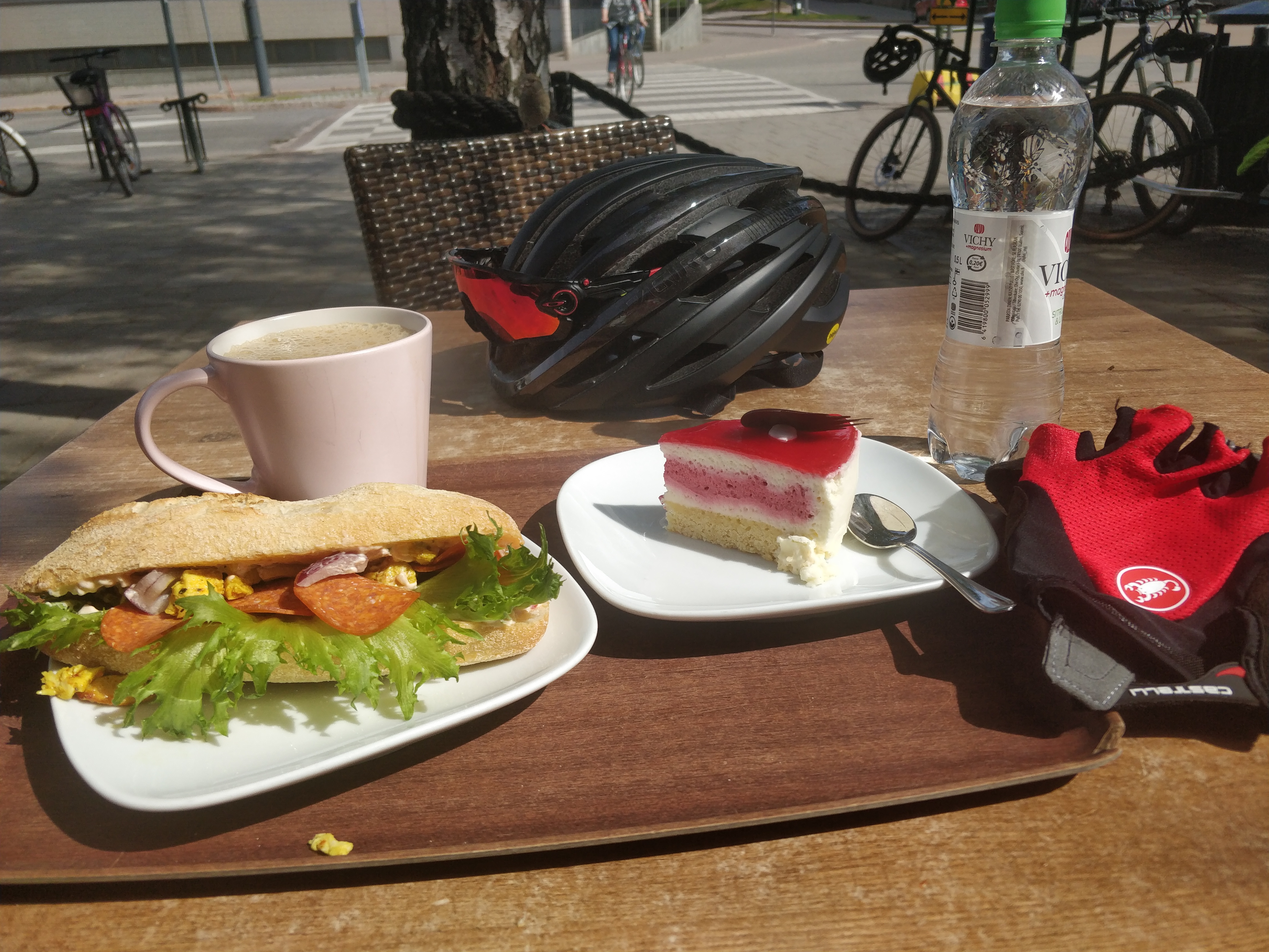 Kohteeksi olin miettinyt etukäteen Järvenpään kulmakonditoriaa, jossa viime kesänä vierailtiin porukalla ja oli muistaakseni hyvä paikka. 60km pyöräilyn jälkeen saavuin perille ja kyllähän siinä olikin jo tankkauksen tarpeessa. Tarjolla oli kaikkea mitä pyöräilyn ystävä voi toivoa, leipiä, kakkuja ja salaatteja. Myös jonkinlainen sunnuntailounas oli saatavilla.