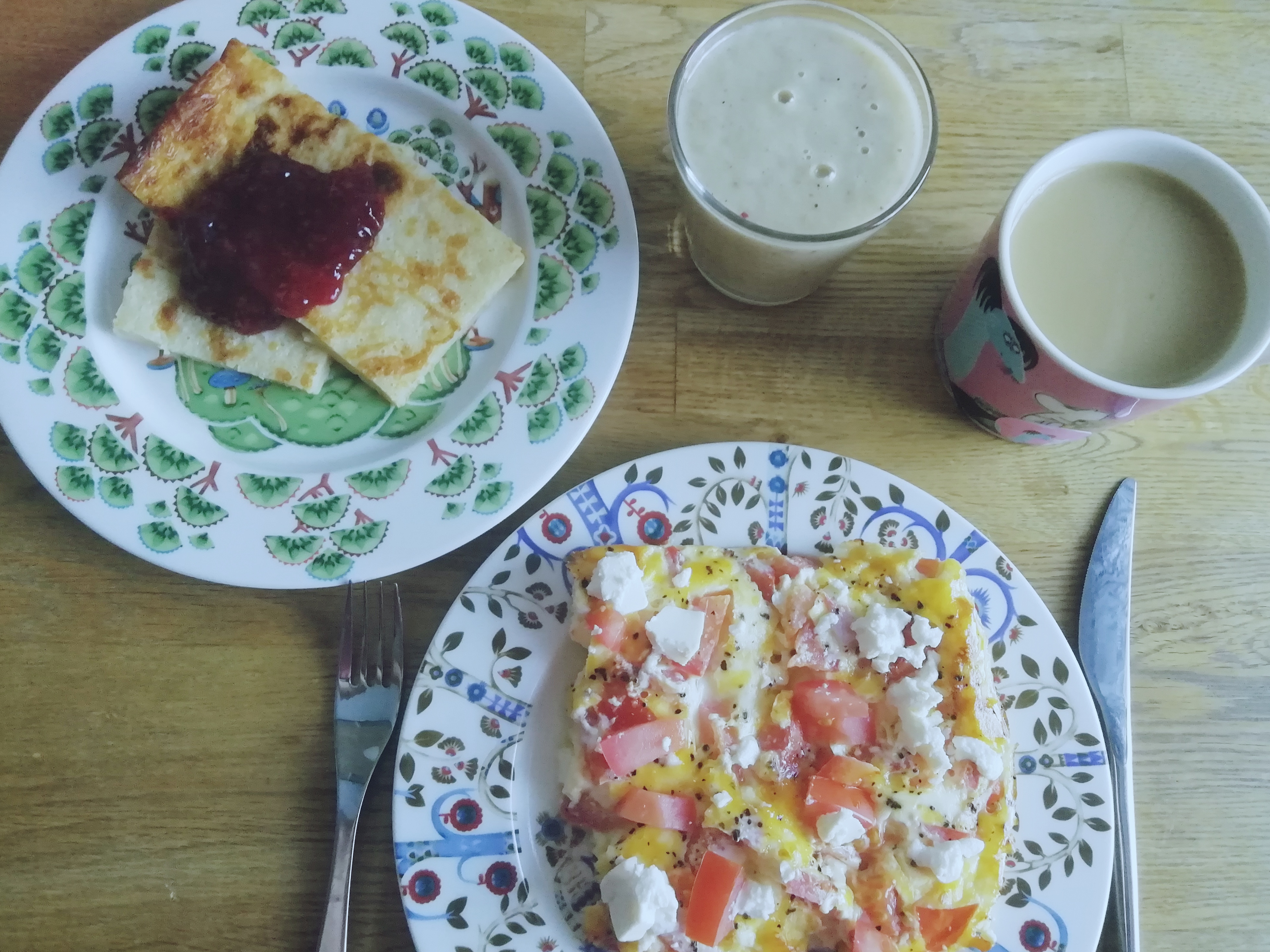 Jokainen, joka on tehnyt reissuduunia, ymmärtää vikojen kotipäivien dilemman. Jääkaapissa safkaa, joka on saatava käytettyä ennen lähtöä. Tänään oli mun vika kotiaamu seuraavaan viiteen päivään. Aina jos mahdollista, niin vikana aamuna haluun vaan lojua pitkään pikkareissa, syödä rauhassa ja kuunnella musaa. Kuvassa jätskiltä maistuva smoothie, feta-tomaattimunakas, pannaria sekä tietty kahvia. Pannari oli aiemmin tehty, ja vaatii ehdottomasti oman kirjoituksensa myöhemmin, koska se on TAIVAALLISEN hyvää. Kuvan alla reseptit. Ai niin, ja musana soi tänään Emancipatorin vanhempi albumi Safe In the Steep Cliffs.