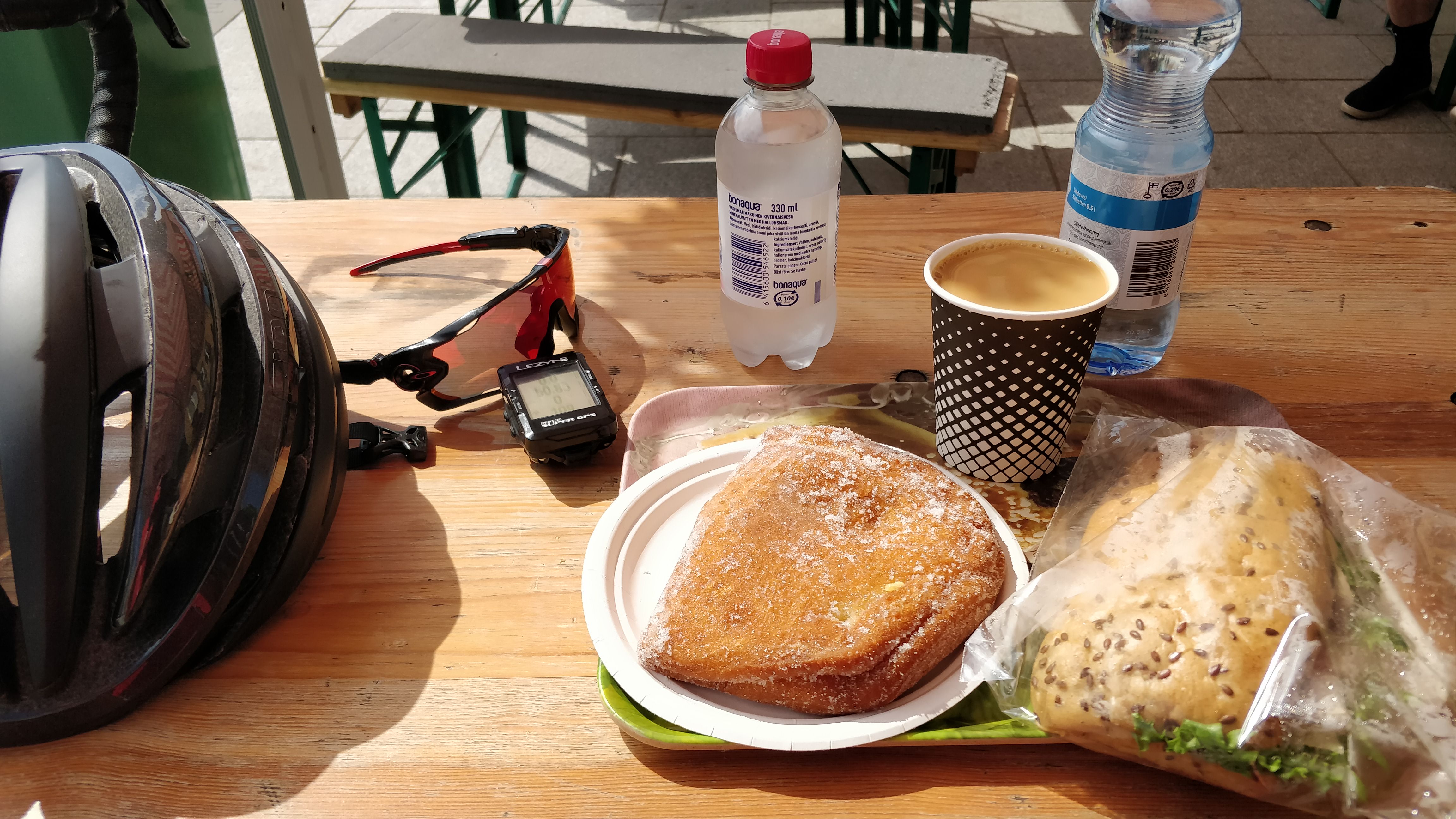 Mitään hirvittävän fiiniä ei kuitenkaan myynnissä ollut, leivonnaisia edusti porkkanakakku kera kermakakkusiivun. Pullaa oli muutamaa sorttia, ja täytettyjä possumunkkeja kolmella eri täytteellä. Leipäosastolta löytyi juusto- sekä kinkkujuustosämpylöitä. Ostin mansikkapossumunkin, kinkkujuustosämpylän, kahvin, vissyn sekä lähdeveden. Hintaa aterialle tuli maltilliset 11,5€. Kahvi ja munkki olivat tosi hyviä, leipä ei yllättänyt suuntaan tai toiseen. Palvelu oli tosi ystävällistä ja katettuja istumapaikkoja riittävästi. Pyöräilijälle tärkeää vesipullojen täyttöpistettä ei ollut, enkä myöskään havainnut wc-tiloja, näitä tosin harvemmin torikahviloista löytyy. Ei siis ihan täydellinen pitstop varsinkaan jos on tarkoitus pyöräillä tuntitolkulla. Mutta muuten kiva paikka hyvällä palvelulla ja munkki oli maukas. 7½/10 pistettä.