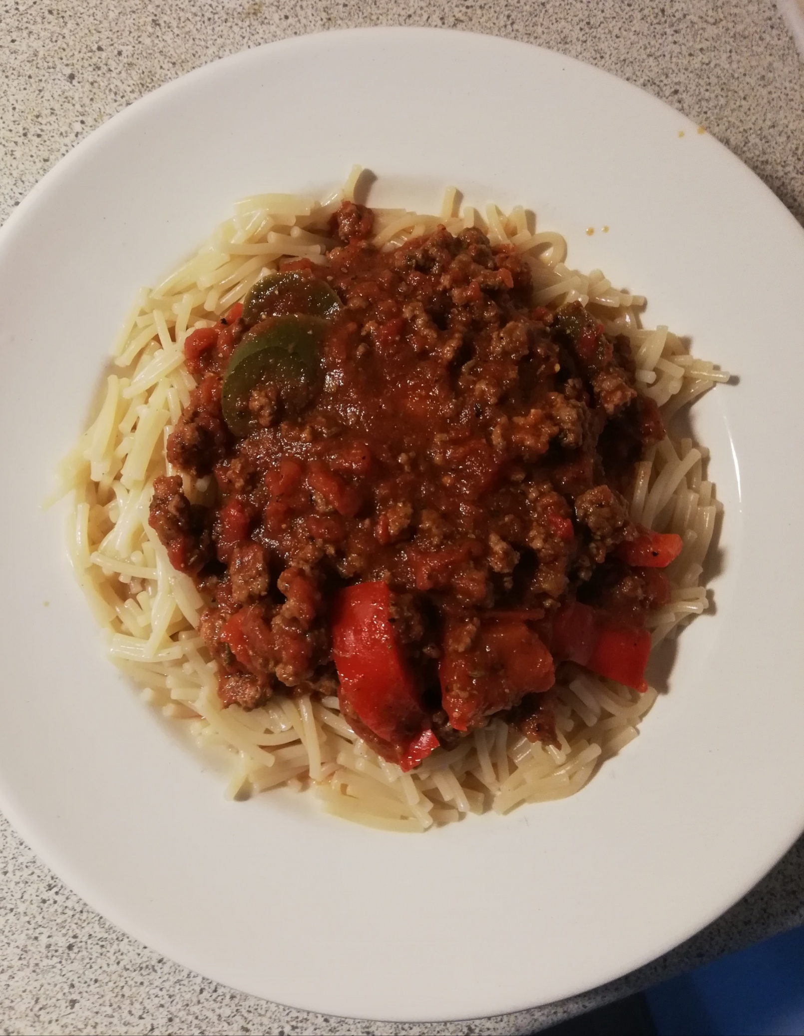 Ruskista ja mausta jauheliha pannulla. Pilko ja lisää sekaan paprika (ja chili jos käytät tuoretta chiliä) tai jalopenoviipaleita, kuten minä tällä kertaa. Hämmentele ja mausta tarvittaessa lisää. Laita spagetti kiehumaan kattilaan ja kaada pannulle lihan ja muiden hötteiden sekaan pari purkkia tomaattimurskaa. Myös salsat ja vastaavat käy. Minullakin resepti elää aina fiiliksen mukaan. Tässä vaiheessa viimeistään on hyvä huiskia soosin sekaan tulisia mausteita mitä kaapista löytyy ja sekoitella.