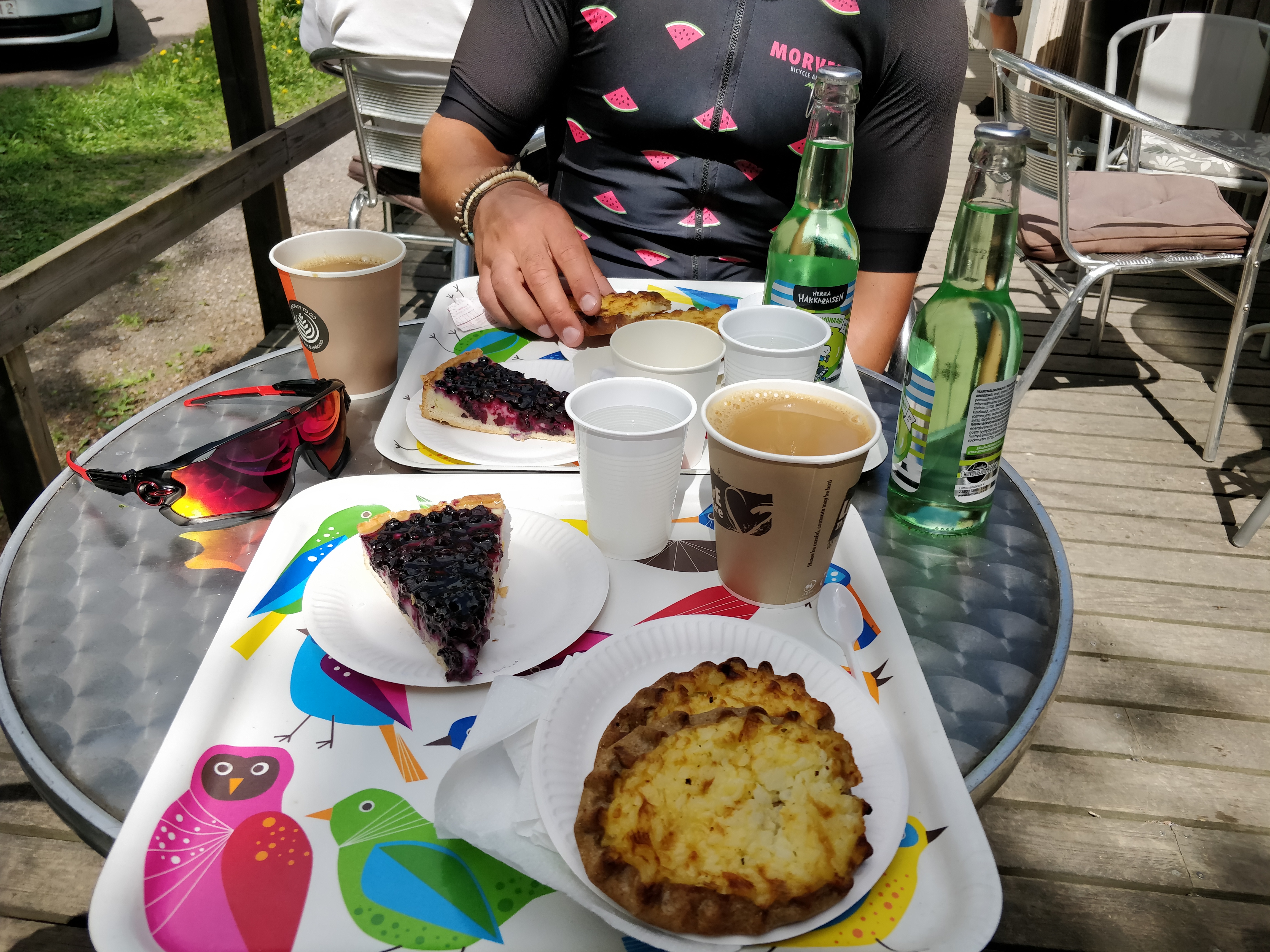 Hakkaraisten lisäksi päädyimme mustikkapiirakkaan, kahviin, sekä kahteen karjalanpiirakkaan per naama. Piirakoille ei tarjoutunut mitään lämmitysmahdollisuutta, puhumattakaan että niiden päälle olisi ollut jotain laitettavaa. Mikro olisi mahdollisesti voinut löytyä, mutta ei alettu kyselemään, koska asiakaspalvelijalla ei tainnut olla kovinkaan hyvä päivä – ”Joo kaikki on vähän rikki ja valikoimakin on mitä on”. Mustikkapiirakka oli yllättävän hyvää, kuten tietysti myös Herra Hakkarainen. Mutta kylmät ja kuivat piirakat eivät olleet ihan sitä mitä lähdettiin kahvipaussilta hakemaan. Naapuripöydän rouvat kehuivat toisilleen kuinka munkit olivat hyviä, luulen että se onkin ainoa mitä kyseisessä paikassa kannattaa nauttia kahvin kera. Hintataso oli yllättävän kova, meidän kahden eväät maksoivat yhteensä kohtalaisen ynseät 26€. Ateroinnin jälkeen itselläni harmitti niin paljon että lenkki sai jäädä kesken ja poljin kotiin tilaamaan pitsaa. En kyllä voi suositella Pitkäkosken ulkoilumajaa pyöräilyn ystäville, wc-tiloja tai vesipullojen täyttöpistettäkään ei sattunut silmään. Munkkikahvitteluun paikka varmasti sopii hyvin, sijaintikin oli aika mukavasti luonnon keskellä. 5/10