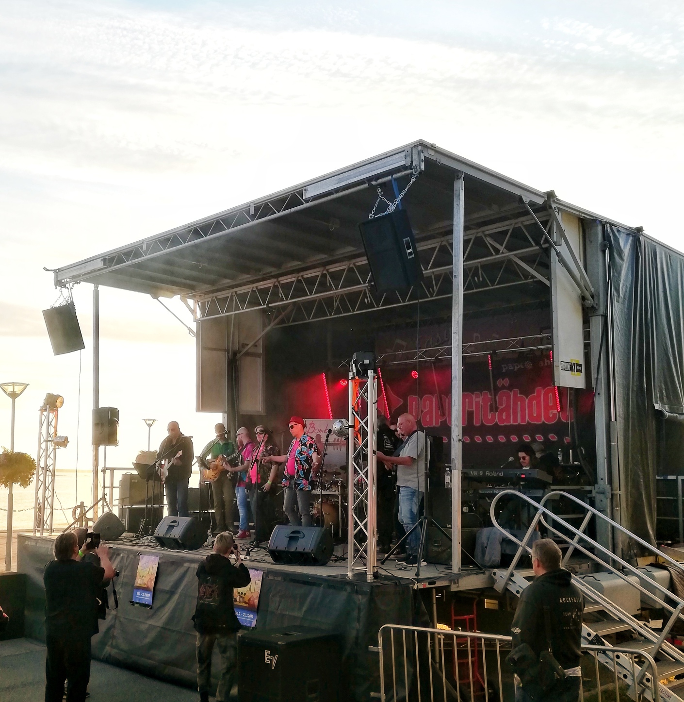 Sisäsatama ei varsinaisesti vielä ollut täynnä ihmisiä, mutta sen verran, että veljen kanssa saatiin väijyä istumapaikkaa melko pitkään. Yksi pöytä sitten saatiinkin kun Kemin kaupungin rullaluistelijat nimellä esiintynyt orkesteri alkoi esittämään vähemmän tunnettuja Juicen biisejä. Siinä keikan aikana alkoi muitakin tuttuja valua paikalle ja pöydässä kävikin porukkaa, aina pikkusiskosta lähtien, jututtamassa mukavaan tahtiin. Paperitähdissä bassoa soittava kaverini kävi myös moikkaamassa ja tiesi kertoa, että heillä on setissään 28 kappaletta pelkkiä hittejä. Paperitähtien mukana olevista vierailijoista tuli kans tarinaa ja kerroinkin jo edellisiltana sattumalta tavanneeni Antti Tammilehdon.