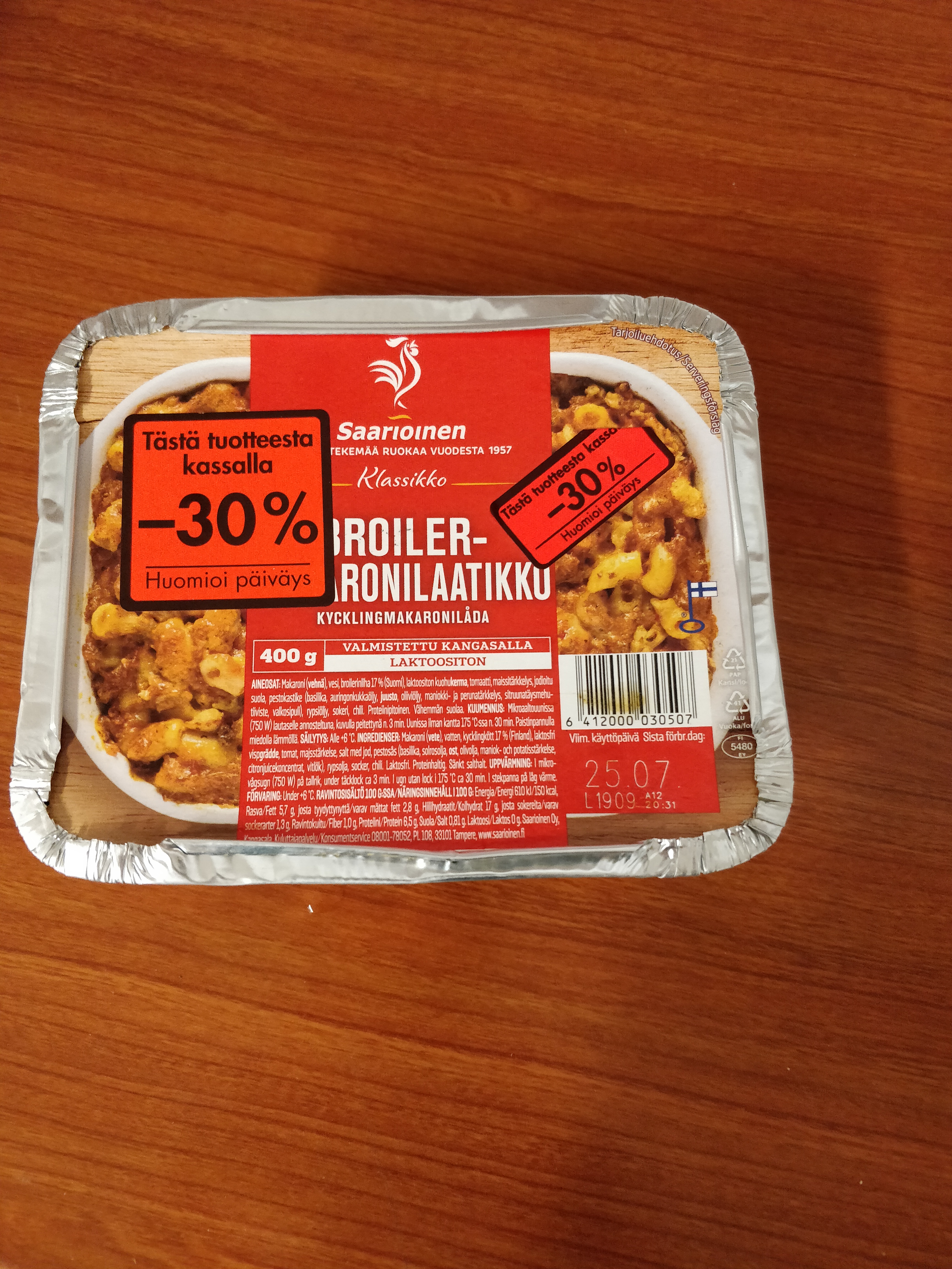 En usko että viimeisen käyttöpäivän läheisyys tätä ruokaa oli pilannut, joten on todettava tämä massiiviseksi pettymykseksi. Hinta sinänsä oli ihan edullinen, mutta samaan rahaan olisi saanut myös kaksi halvinta mikropitsaa. Annan Saarioisen Broilermakaronilaatikko -30%:lle 1/5 pistettä