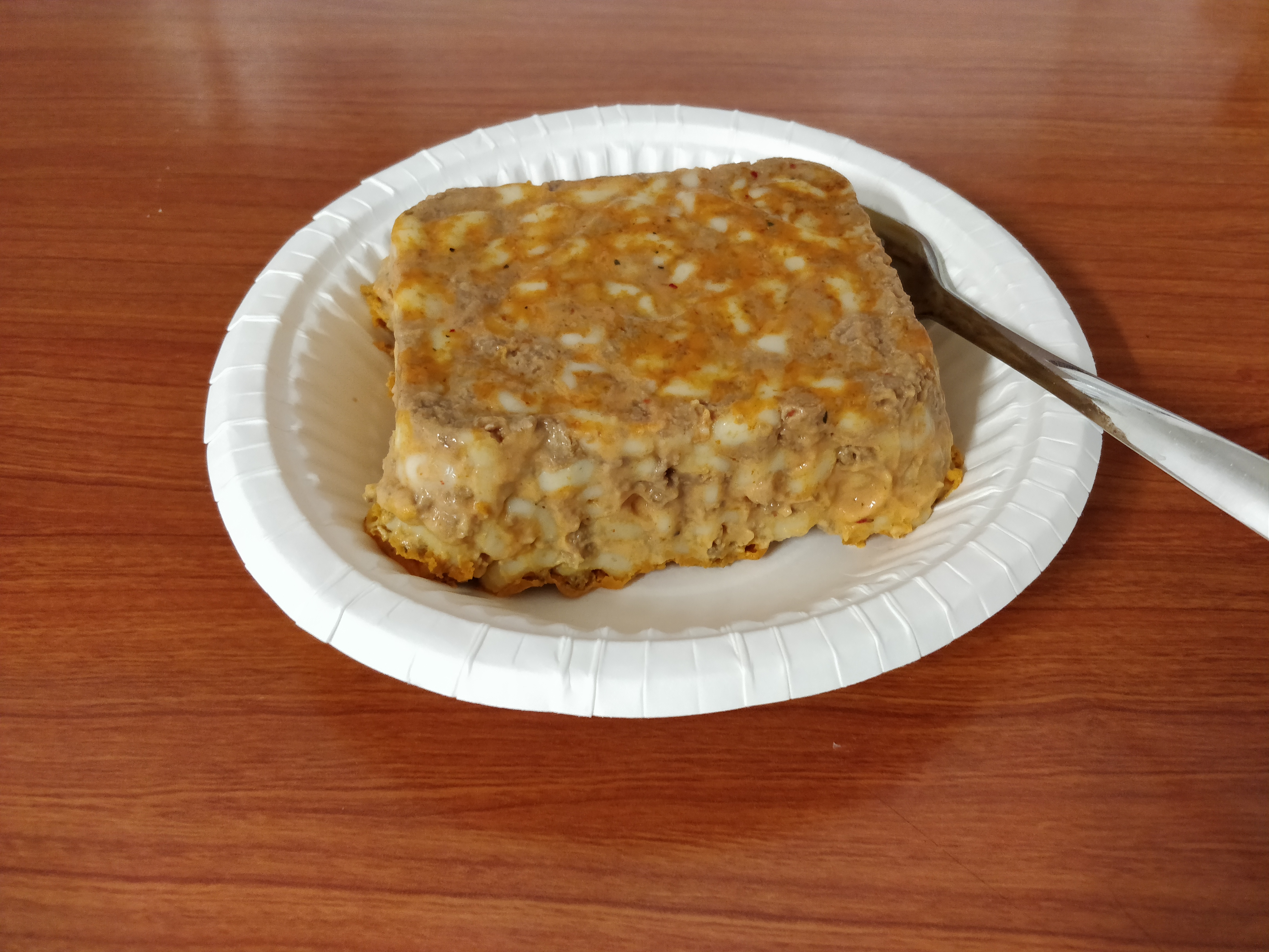 Ulkoisesti ruoka näyttää jopa hieman normaalilta makaronilaatikolta, jonkin verran on enemmän väriä mukana, ikäänkuin jotain kastiketta olisi joukkoon lisätty. Munamaitotyyppistä valkoista osuutta tosin ei ole havaittavissa lainkaan.