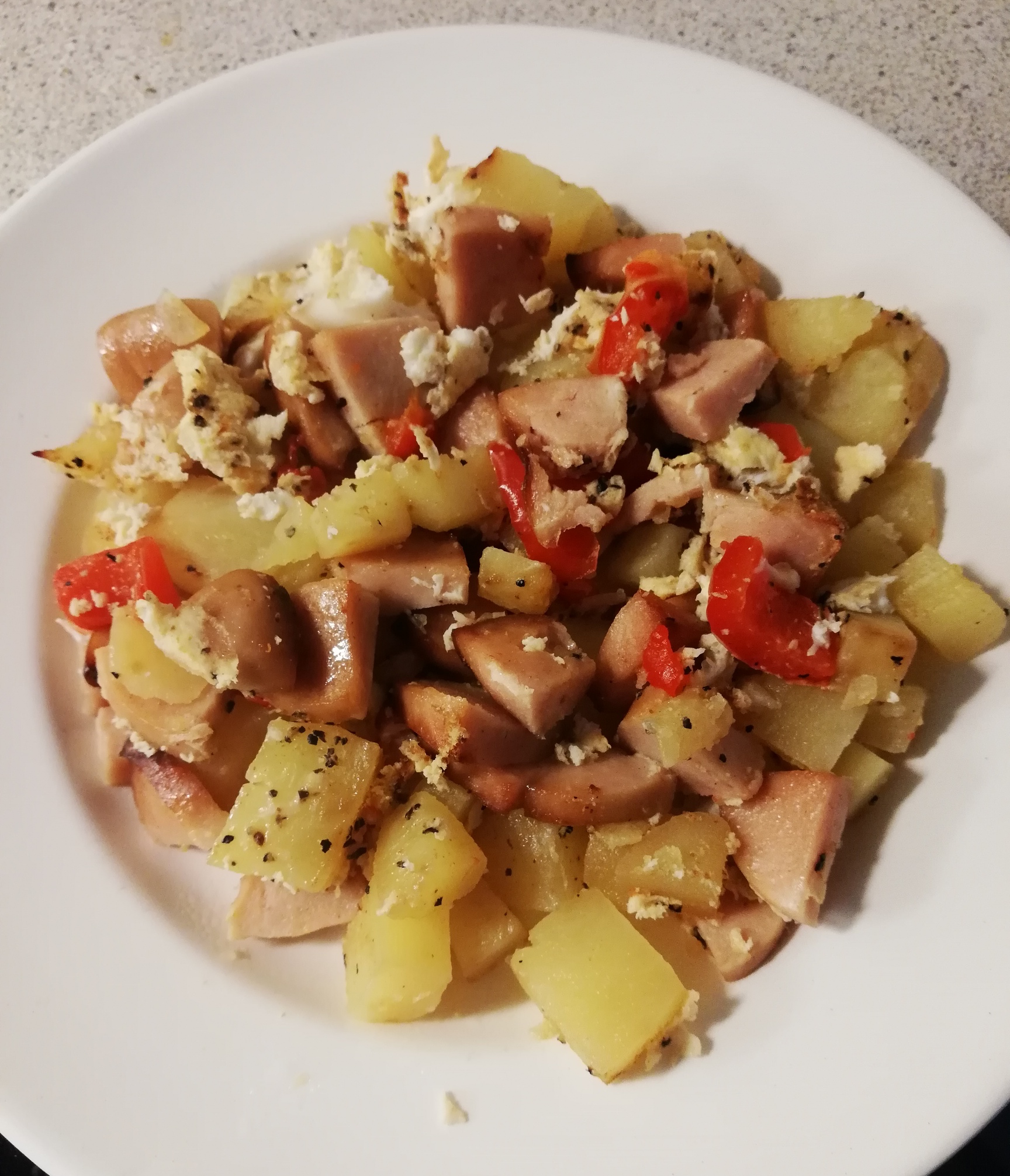 Kuori ja pilko kuutioiksi reipas puolikiloa perunoita sekä yksi paprika. Ei muutakuin pilkotut potut ja paprikat vuokaan. Viskaa päälle vähän suolaa ja mustapippuria tai mausta oman maun mukaan. Uuni 225 astetta ja vuoka sinne noin puoleksi tunniksi. Odotellessa pilko valmiiksi Suomen monipuolisin vihannes, mutta puolet HK:n sinisestä riittää, eli yksi käyrä. Sekä riko kolme munaa kuppiin, vähän suolaa sekä valkopippuria ja sekoita munat sekaisin. Tässä vaiheessa on hyvä hetki katsoa vähän aikaa Netflixiä, mutta kellon juostua puolituntia ota vuoka pois uunista. Levitä makkaran palaset pottujen ja paprikan päälle vuokaan. Lopuksi kaada kananmuna sekoitus kupista koko sotkun päälle ja laita vuoka takaisin uuniin 25 minuutiksi sekä jälleen Netflix rullaamaan. Pian sinulla kolme annosta pyttipannua ja olet samalla katsonut jakson Netflix-sarjaa. Apropoo Netflixin voi korvata myös kirjalla, mutta sitä ei välttämättä pääse loppuun asti.