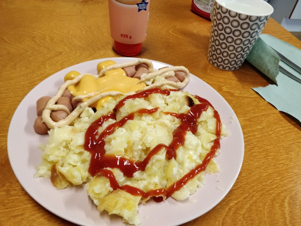 Hevoshuutaja: Meikä siis postailee lähes joka päivä whatsappiin kuvia meikän lounaista. Tuona kyseisenä päivänä oli eväänä nakkeja ja kermaperunoita. Löysin vielä työpaikan jääkaapista cheddar-sulatejuustoa, jolla kuorrutin nakit. Mausteena toimivat Kavlin dressing sekä ketsuppi. Voin kertoa että oli hyvää.