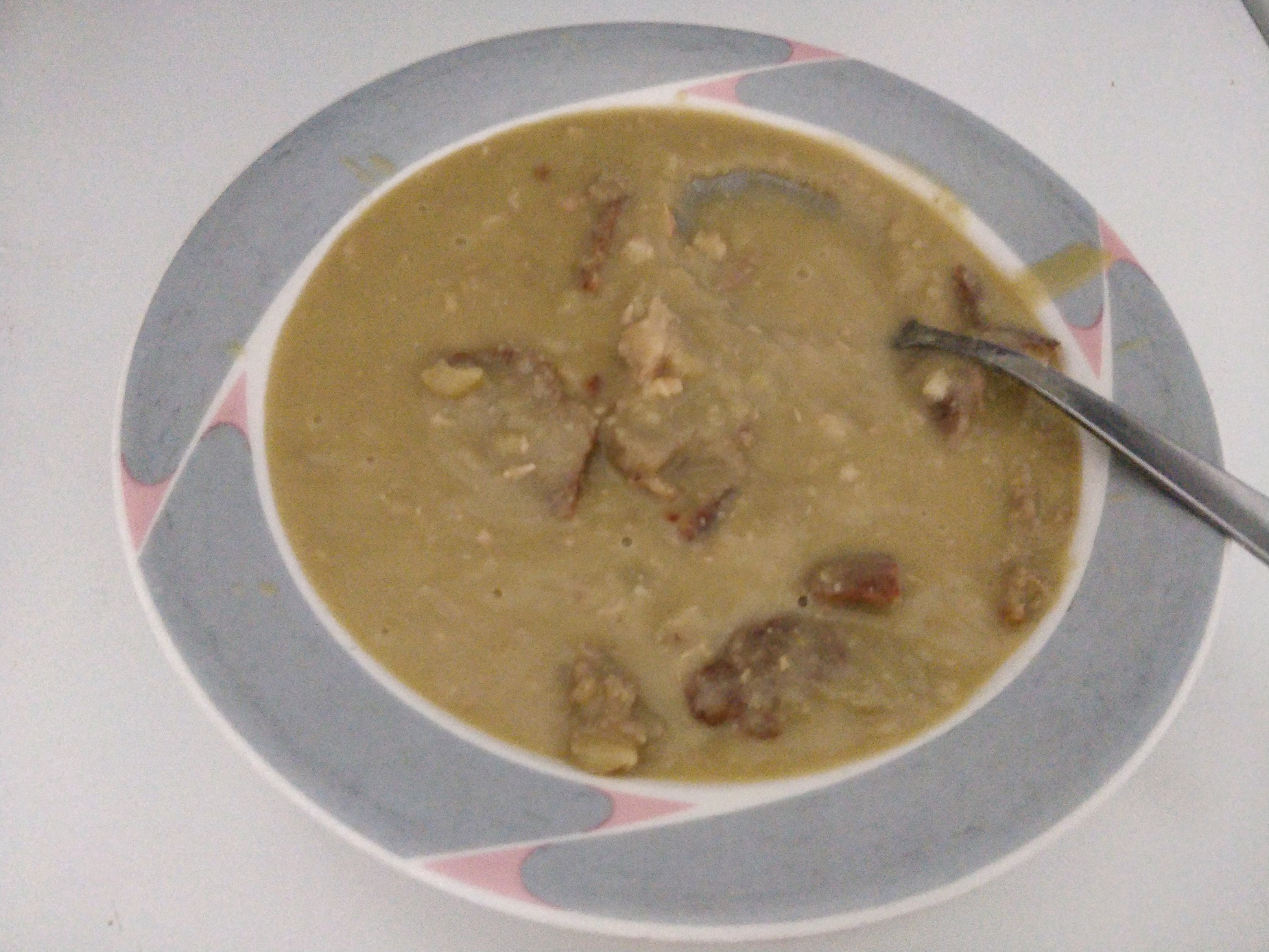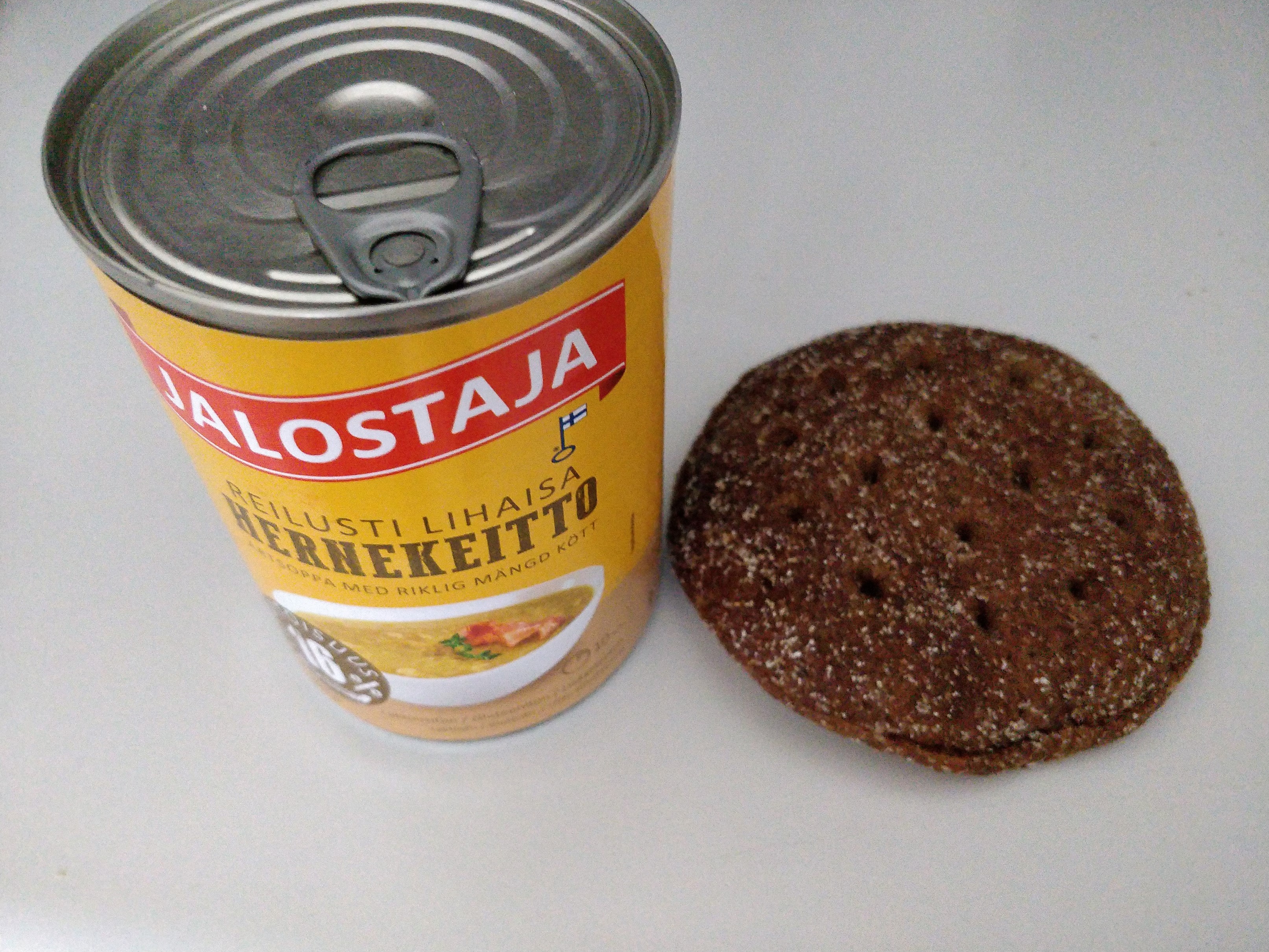 Töiden jälkeen en jaksanut kauppaan joten oli syötävä mitä kaapista löytyy. No eihän sieltä paljon löytynyt. Hernekeittopurkki sentään, ja siihen laitoin sekaan ruisleipää tuomaan vähän rakennetta.