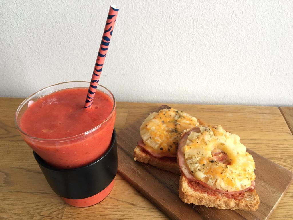 Lounaalla söin pari lämmintä voileipää, joita olin tehnyt edellisenä iltana sekä ison smoothien. Smoothieen hurahti tänään mandariinia, mansikkaa, punaherukoita ja ananaskirsikoita. Lopputulos maistui karkilta.