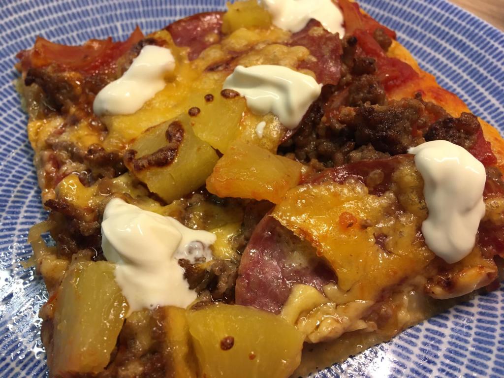Päivälliseksi tein pitsaa. Mulle tärkeintä pitsassa on oma tomaattikastike. Itse asiassa keittelinkin ison kattilan eilen tomaattikastiketta, sillä mä käytän sitä tosi moneen safkaan. Helpompi tehdä siis paljon kerralla, ja vaikka pakastaa osa! Mä totaalisesti unohdin ottaa kuvan ainesosista, mutta kyllä tästäkin hieman katsomalla selviää, mitä täytteitä pitsasta löytyy.
