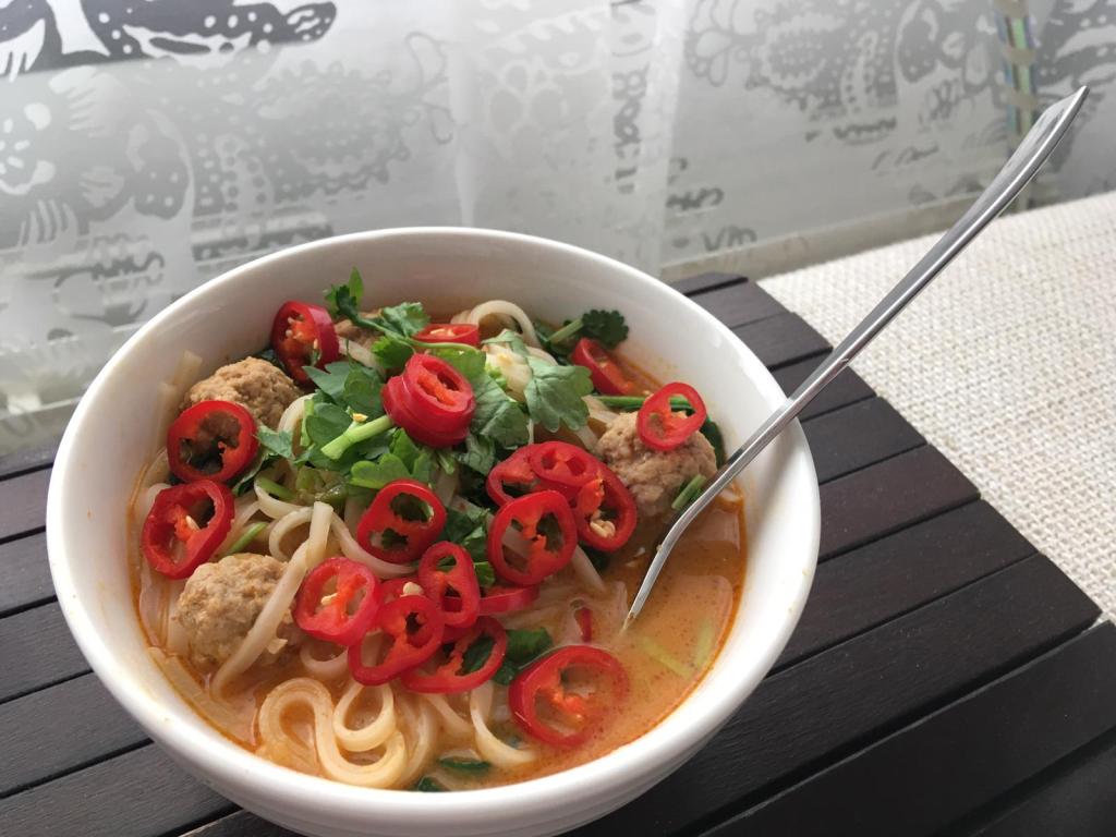 Töiden jälkeen oli vuorossa ehkä ennakkoon haastavin ruoka Hattaran listalta. Jonkinlainen nuudelikeitto jossa on helvetisti aineksia mutta ei mitään ohjetta. Ajattelin että kyllähän sitä nyt yhden nuudelikeiton tekee enkä kysellyt sen tarkemmin reseptin perään. Mutta kun mainitsin ohimennen että ajattelin vain laittaa kaikki ainekset kattilaan ja keitellä kunnes nuudelit ovat kypsiä, Hattara tarjosi linkin reseptiin. Resepti täällä.