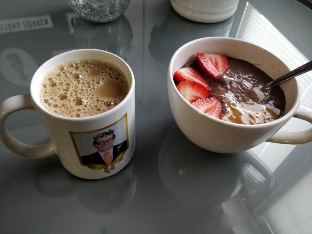 Olin edellisiltana laittanut chia-siemenet kauramaitoon odottelemaan aamua, koska internetissä sanottiin että niin kannattaa tehdä. Aamulla hämmennys oli suuri kun maito ja siemenet eivät olleetkaan integroituneet toivotulla tavalla. Jonkinlaisia könttejä siinä oli mutta eihän se puuroa muistuttanut sitten yhtään. Olin lukenut internetistä myös että sekaan voi vaikka laittaa banaania. Eli eiku uusi suosikkiasiani blenderi soimaan ja banaani ”puuron” sekaan. Tämän jälkeen en oikein tiedä mitä tapahtui, mutta ennenkuin huomasinkaan, olin laittanut sekaan myös jacky-kaakaovanukkaan. Karmea tyylirikko, ajattelin, mutta tätä on vielä tulossa toisenakin päivänä, jospa silloin hillitsen blendaushimoni.