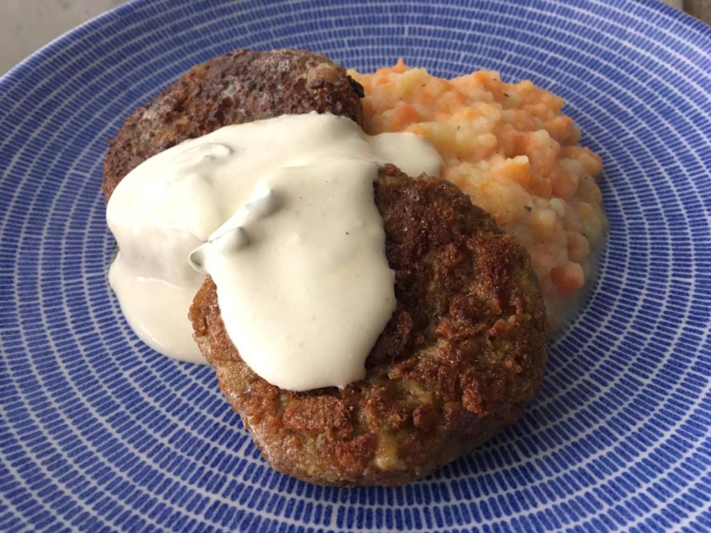 Tein hernekeitosta pihvejä, jotka leivitin mm. ruisleivällä. Pihvien kanssa oli tarjolla porkkana-perunamuusia ja sinappista kermaviilikastiketta.