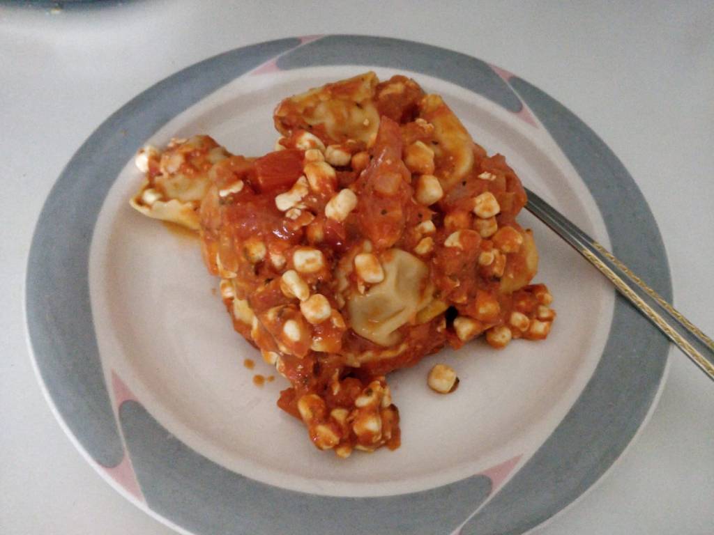 Töiden jälkeen edellispäivän mifu-tortelloni-tomaattimössöä.
