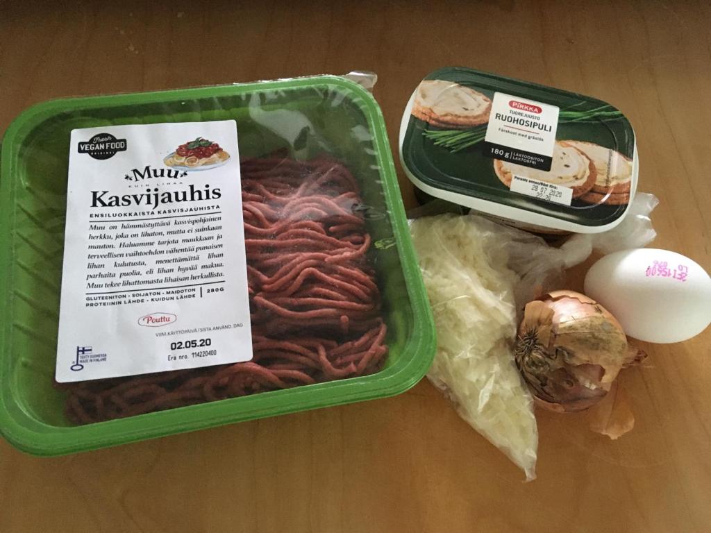 Päivällinen tuotti päänvaivaa, sillä olin lupautunut kokkaamaan ystävien kesken, ja joukossa tietysti kasvissyöjä. Vaikka makkara on lähes kasvis, päätin taas vaihtaa päivien järjestystä ja tarttua lihamurekkeen kimppuun. Siis lihattoman lihamurekkeen.
