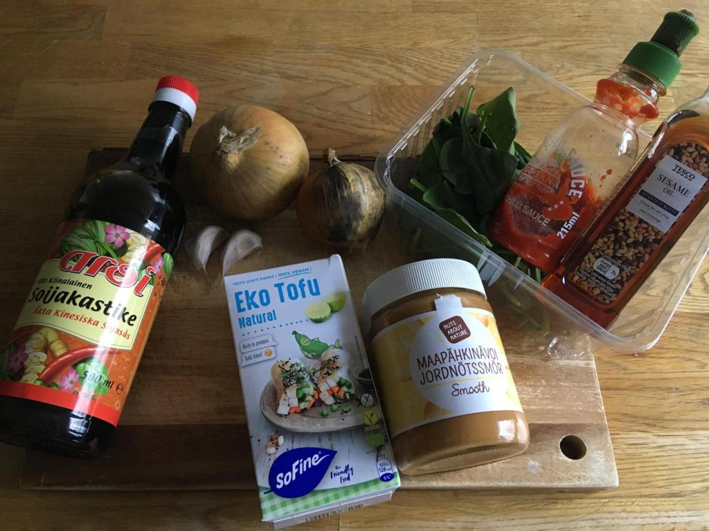 Päivän pääruuaksi jotain pinaatti-tofu-maapähkinäjuttua. Unohdin ottaa omista aineksistani kuvan, mutta mukana oli kaikki samat kuin Hattaralla, tuota seesamiöljyä lukuunottamatta.