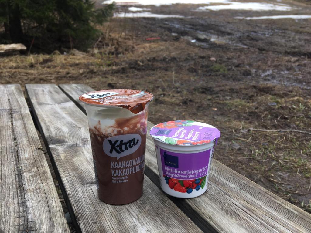 Lounas meni jälleen metsässä. Eväänä Hevoshuutajan suosittelemaa ”suklaavanukasta”. Luojan kiitos mulla oli tuo toinen jugurtti mukana, sillä luovutin vanukkaan kanssaretkeilijälle.