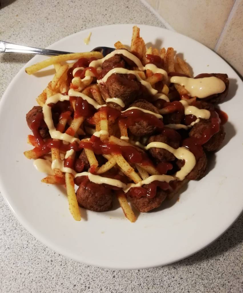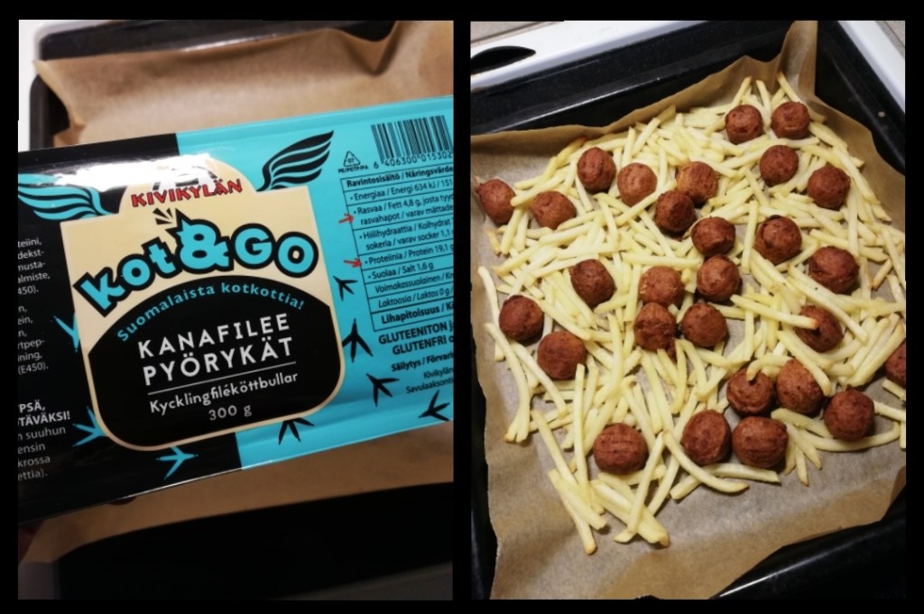 Tästä ei siis sapuska enää simppelimmäksi muutu. Tämä on helppoa kuin hengittäminen. Ei muuta kuin uuni kuumaksi ja pyörykät ranujen kanssa sisään. Reilua varttia myöhemmin satsi ulos ja mausteet päälle. Minulla on nyrkkisääntönä kokkailussa, että ruuan pitää maistua ja sooseissahan sitä makua on, joten ruuttasin vielä lautaselle siihen päälle ketsuppia, srirachaa ja chilimajoneesia. Voilà! Ruoka oli oikein hyvää ja sitä oli riittävästi, sillä siitä lämmitti vielä puolet myöhemmin päivälliseksikin. Kokkailumusana oli tällä kertaa J. Karjalaisen Telepatiaa biisi. Sen tahtiin oli hyvä maustaa ja samalla laulaa mukana ”tähtilampun alla, siinä sängyn laidalla, kun me kerran suudeltiin, oi mä uskoin ihmeisiin”. Kokkailumusan suhteen on tärkeää, ettei kuuntele liian räyhäkästä musiikkia. On nimittäin käynyt eräänkin kerran ”Hupsista saatana!” mausteiden kanssa, kun on kuunnellut esim. System of a downia tai Five finger death punchia. Jokatapauksessa tällaista oli siis Hampuusilla eilen. Aamupalasta en ehtinyt kuvaa napata kun vierailupyyntö tuli vasta sen jälkeen, joten jätin iltapalankin pois ja keskityin lämpimään ruokaan. Kiitos tästä! Oli mukava päästä vierailemaan juttusarjassa jota on seurannut suurella mielenkiinnolla.