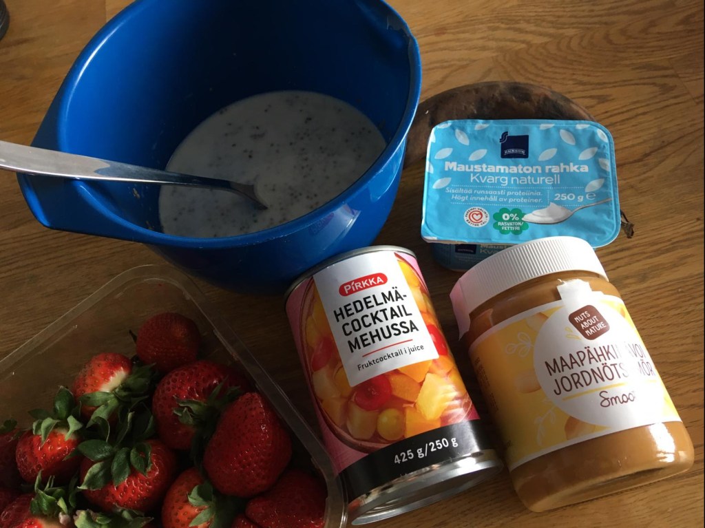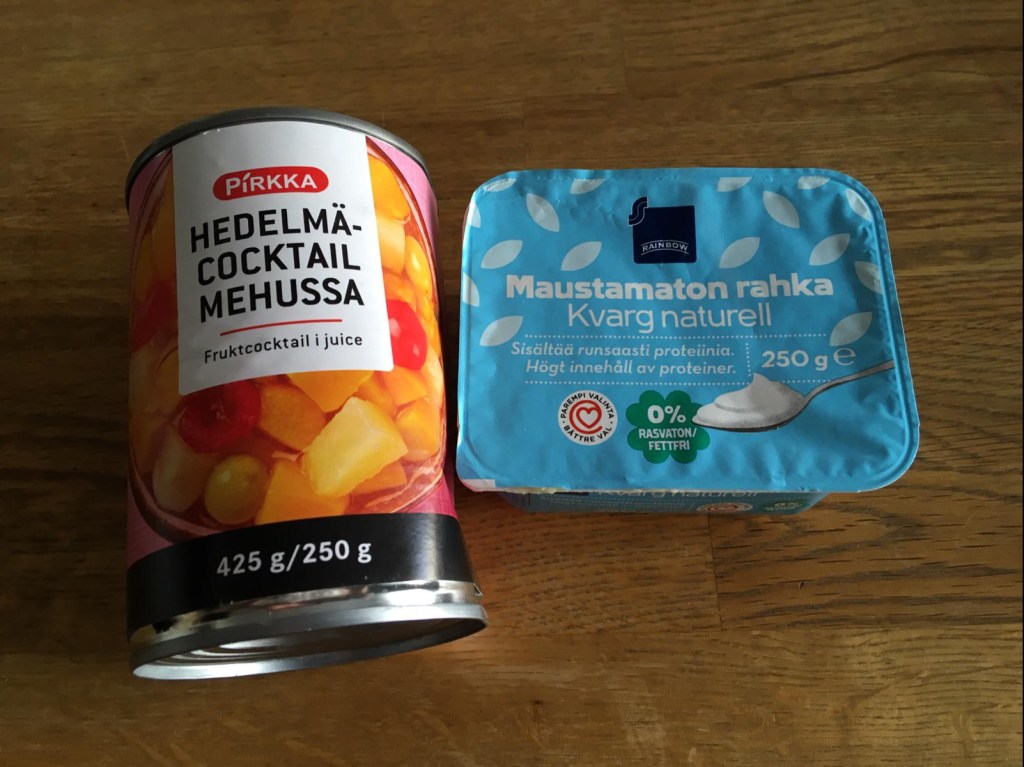 Lounaaksi sain lähes tulkoon ”omaa” ruokaa. Hevoshuutaja oli ostanut cocktailhedelmiä ja rahkaa! Pohdin eka, et kaivelisin ne jäätävät kirsikat sieltä suoraan biojätteeseen, mut sit totesin, et silmät kiinnihän näistä ei edes erota, mikä hedelmä on kyseessä.