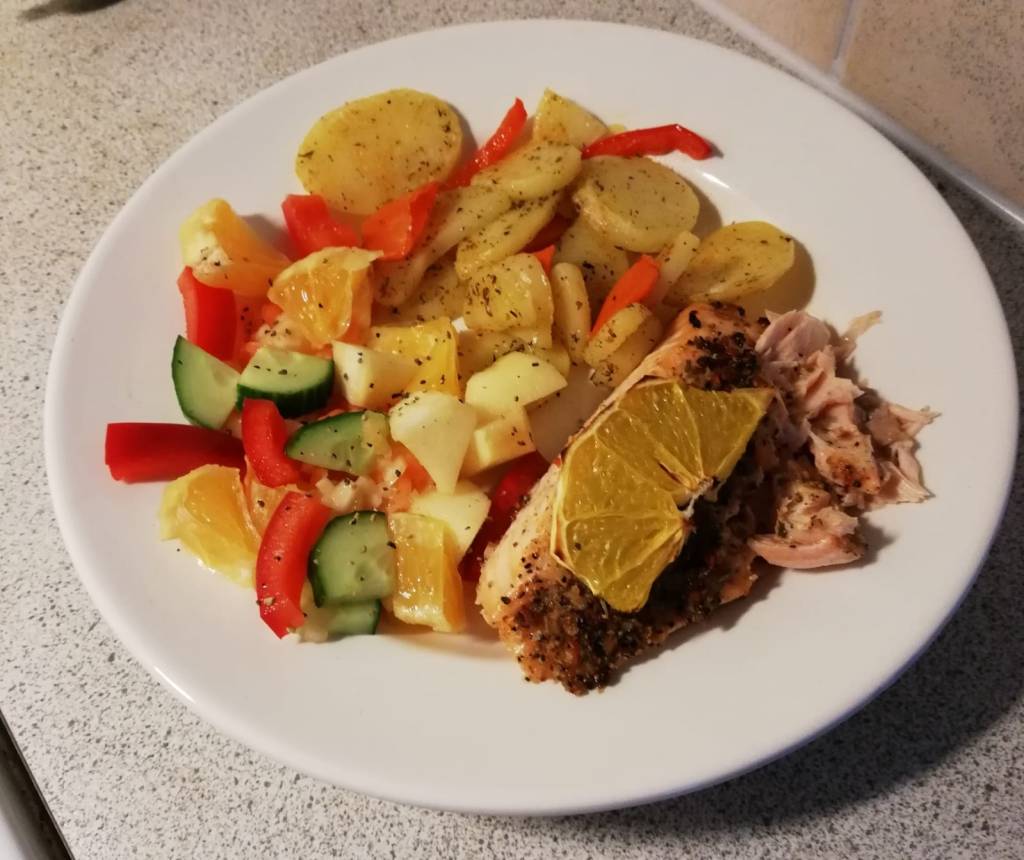 Minulle kehuttiin muutama vuosi sitten appelsiini-uunilohta ja lupasin testata. Sanani mittaisena miehenä päätin nyt sitten testata nyt. Tässä taas elävä esimerkki, että jos mies aikoo jotain tehdä, niin ei siitä tarvitse olla joka viikko muistuttamassa. Kyllä se sen tekee. Ensin leikkasin appelsiinin puoliksi ja puristin siitä lohen päälle mehun. Sitten maustoin kalan oman tapani mukaan. Jonka jälkeen leikkasin toisen puoliskon viipaleiksi ja levittelin niitä kalan päälle. Sen jälkeen se olikin valmis uuniin.
