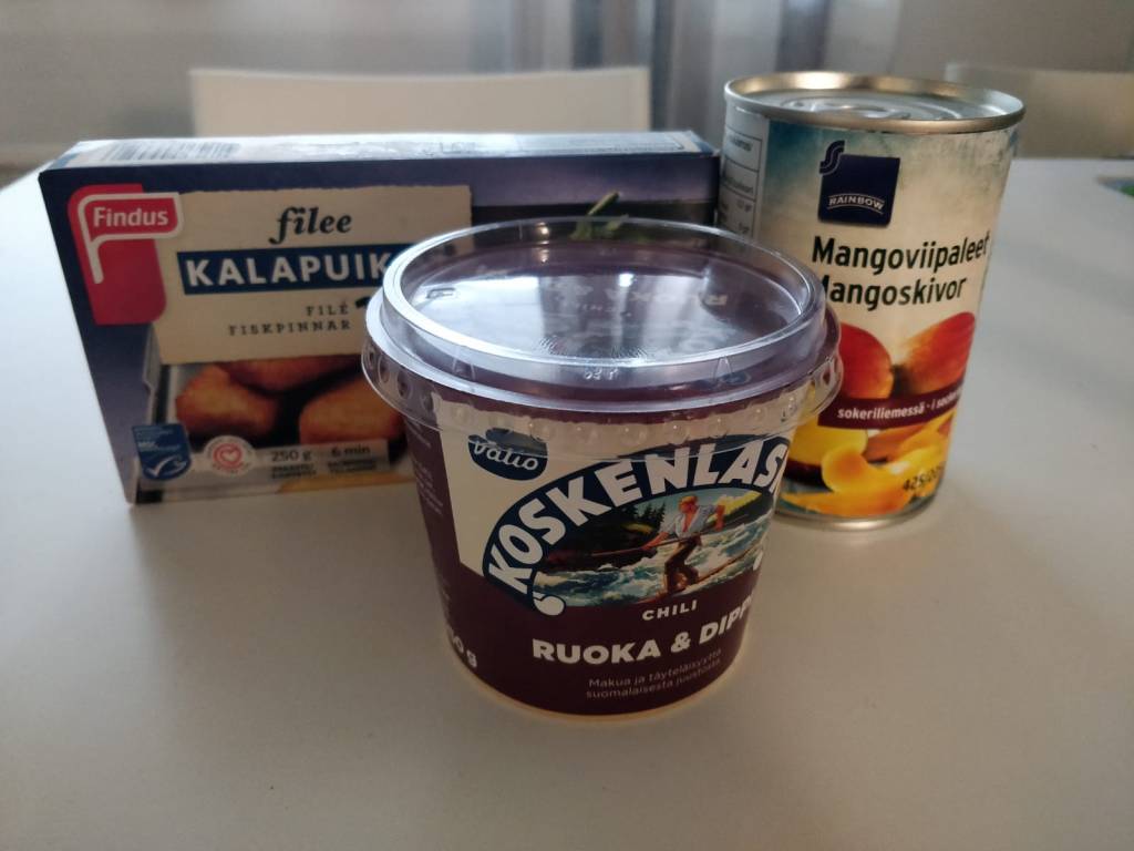 Kalapuikkohodareita mangolla ja koskenlaskijalla. Tämä kyllä epäilytti itseänikin jo alkujaan, mutta olihan se kokeiltava kun idea kerran oli saatu. Tässä mango maistui todella paljon, kalapuikko ei niinkään. Tätä en ehkä suosittelisi tarjottavaksi vieraille. Tai edes itselle. Erikoinen makuyhdistelmä.