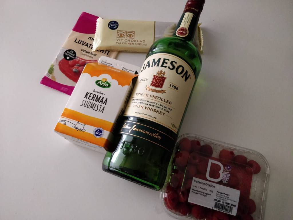 Hevoshuutajan Pannacottaan tulisi valkosuklaata, vähän Jamesonia ja koristeeksi vadelmia. Tämä oli taas yllättävän helppo jälkiruoka valmistaa, jopa edelliskerran sorbettia vaivattomampi.