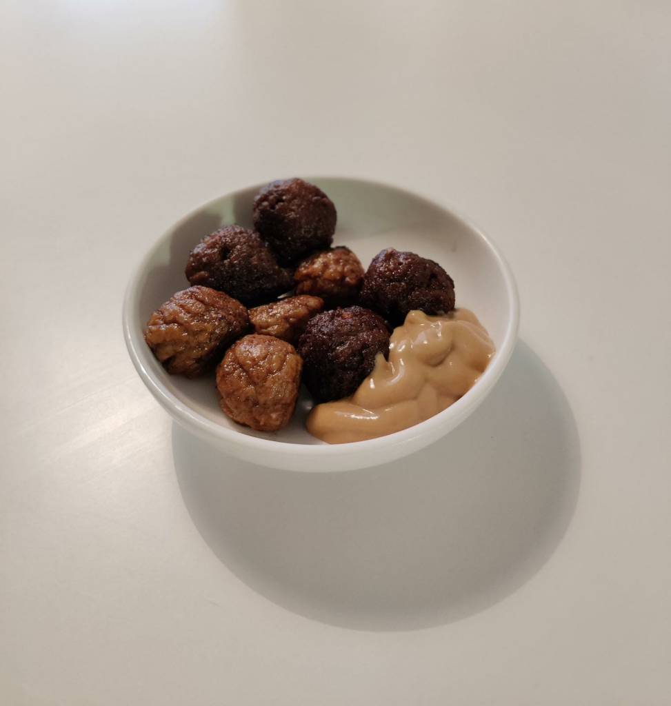 Töräytin myös vähän Meiran sinappia mauksi. Ensin chilivuusto. Rakenne muistutti hieman Boltsin vastaavaa, ollen kuitenkin aavistuksen kiinteämpi. Maku ei sinänsä tempaissut mukaansa, ja oli hieman makeahko. Mutta ei huono missään nimessä, ja varsinkin sinappi taittoi liian makeuden pois. Seuraavaksi maistoin anamman vegobollarpyörykkäpullaa. Aika kiva! Todella kiinteä koostumus, ja vaikka maku ei mikään voimakas olekaan, niin kyllä sitä voi lihapullaksi sanoa. Tämä menisi varmasti aivan täydestä oikeana lihapullana sokkotestissä. Mainio kampe.