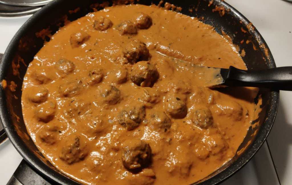Tässä vaiheessa vesi jo kiehui ja katkoin bavetet kattilaan. Niin hieno tämä blogi ei sentään ole että spagettia, anteeksi, bavettea kannattaisi kokonaisena kattilaan laittaan. Kokonaisten syöminen on aina samanlaista räpimistä. Seuraavaksi sipulit ja lihapullat ja pyörykät pannulle. Kun sipuli näytti siltä että se ei ihan hirveästi ainakaan narsku hampaissa, sotkin sekaan tomaattimurskan ja -soseen. Pieni kypsyttely ja purkki kermaa päälle. Väri meni aika hailakaksi, ja vähän jotenki alkoi harmittamaan niin laitoin sitten vielä väriksi srirachaa.