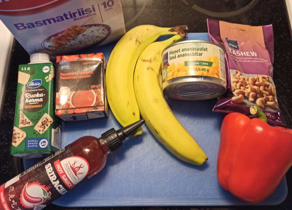 ”Ja sinä hymyilet ja katsot noin. Viet minut aamuun uuteen, kuin kevään ensimmäiseen sateeseen. Sinun sieluusi kiinni päästä voin. Vie meidät tulevaisuuteen, ja jonakin aamuna, ennen sarastusta huomaat, että musta aurinko nousee” ja joku vielä väittää, että Juice ei olisi ollut nero. Kuuntelin lauantai aamulla ennen kauppaan lähtöä Juicea ja hain inspiraatiota kokkailuun. Kaupassa tunsin itseni oman elämäni Indiana Jonesiksi, joka oli uuden eksoottisen seikkailun äärellä, etsimässä jotain tuntematonta aarretta. Kiertelin kaupassa pohtien eri makujen kombinaatiota ja miten ne leikkisivät keskenään makunystyröilläni. Lopulta kaupasta tarttui banaania, ananasta, paprikaa, pähkinöitä, kermaa ja paseerattua tomaattia sekä tonic vettä, mutta mennään siihen vasta myöhemmin.