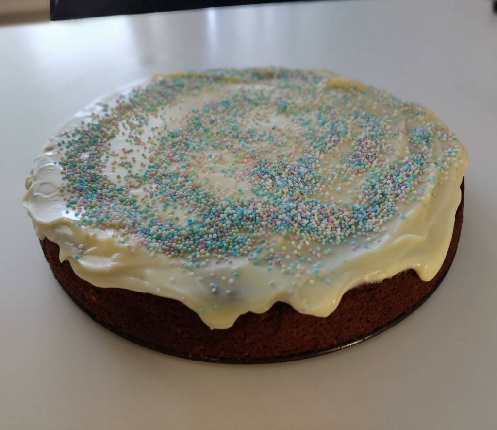 Ruokailun jälkeen olikin jo aika ottaa kakkupohja uunista. Annoin pohjan jäähdytellä itseään hieman ennen päällystystä. Päällystä valmistaessa mietin että siihen sopisi varmasti mainiosti baileys sekaan. Harmi kun se oli loppu. Ohjeessa porkkanakakun päälle laitetaan viimeisenä silauksena pähkinärouhetta. No unohdin sen kuitenkin kauppaan joten nonparellit saivat kelvata. Kaapissa oli sellasia keltaisia sitruunanonparelleja jotka olisivat varmasti sopineet tosi hyvin, mutta jostain syystä eivät tulleet purkista ulos kovista yrityksistä huolimatta. Roskiin meni sekin. Värilliset tulivat sopuisasti purkista joten niillä mentiin.