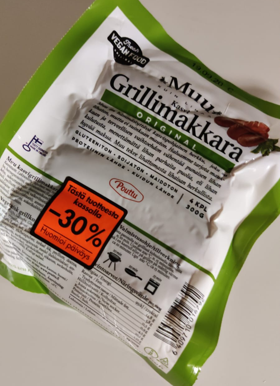 Kuten eilen kerroin, lämmittelin lauantaisaunan yhteydessä kiukaalla kasvismakkaraa. En ehkä olisi muuten ostanut, mutta kun pakettiin oli laitettu vastustamaton -30% tarra, niin ajattelin että mikä nottei. Kyseessä siis muu-sarjan kasvisgrillimakkara.