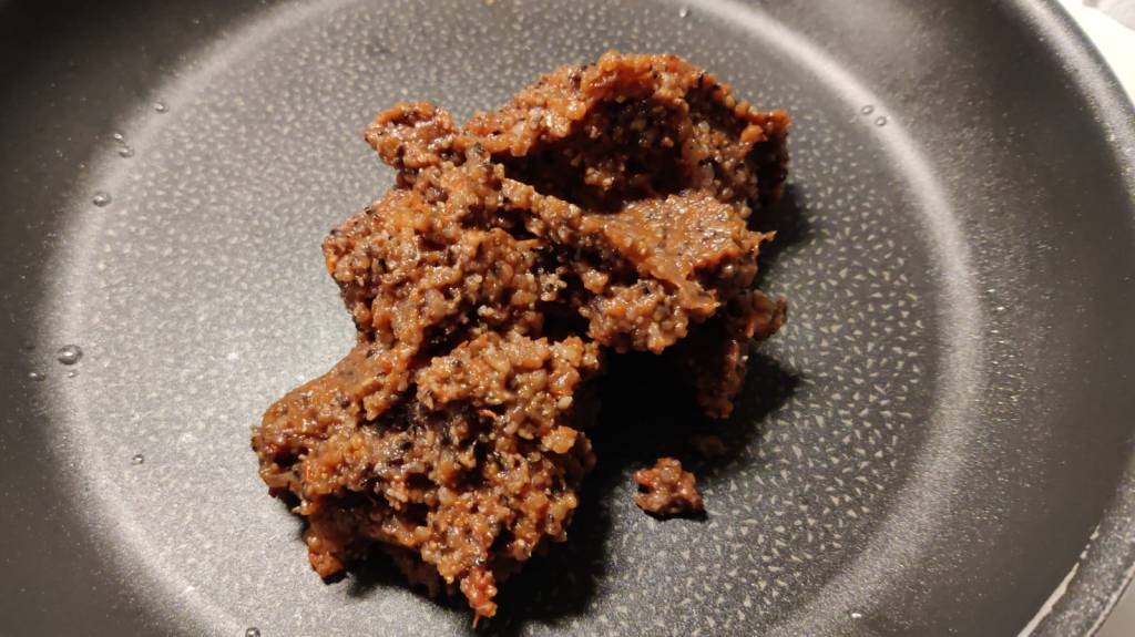 Lopputulos on aivan hyvännäköinen, ehkä hieman tummahko normi lihaversioon verrattuna. Mutta maku oli kuitenkin kohdallaan. Todella hyvin maustettu kampe. Koostumus oli myös mukavan kiinteä ja tuntui suussa oivalta. Makutestien jälkeen heitin sekaan vielä vähän ketsuppia ja tilanne parani entisestään. Positiivinen yllätys. Varmaan tämmönen olis mahdollista itsekin vääntää kasvijauhiksesta, mutta kyllähän jonkun muun tekemä ruoka aina maistuu paremmalta. Oli myös hyvin täyttävää ja piti nälän loitolla pitkään. Tätä voisi kokeilla joskus vaikka lasagnentekoon. 4 / 5