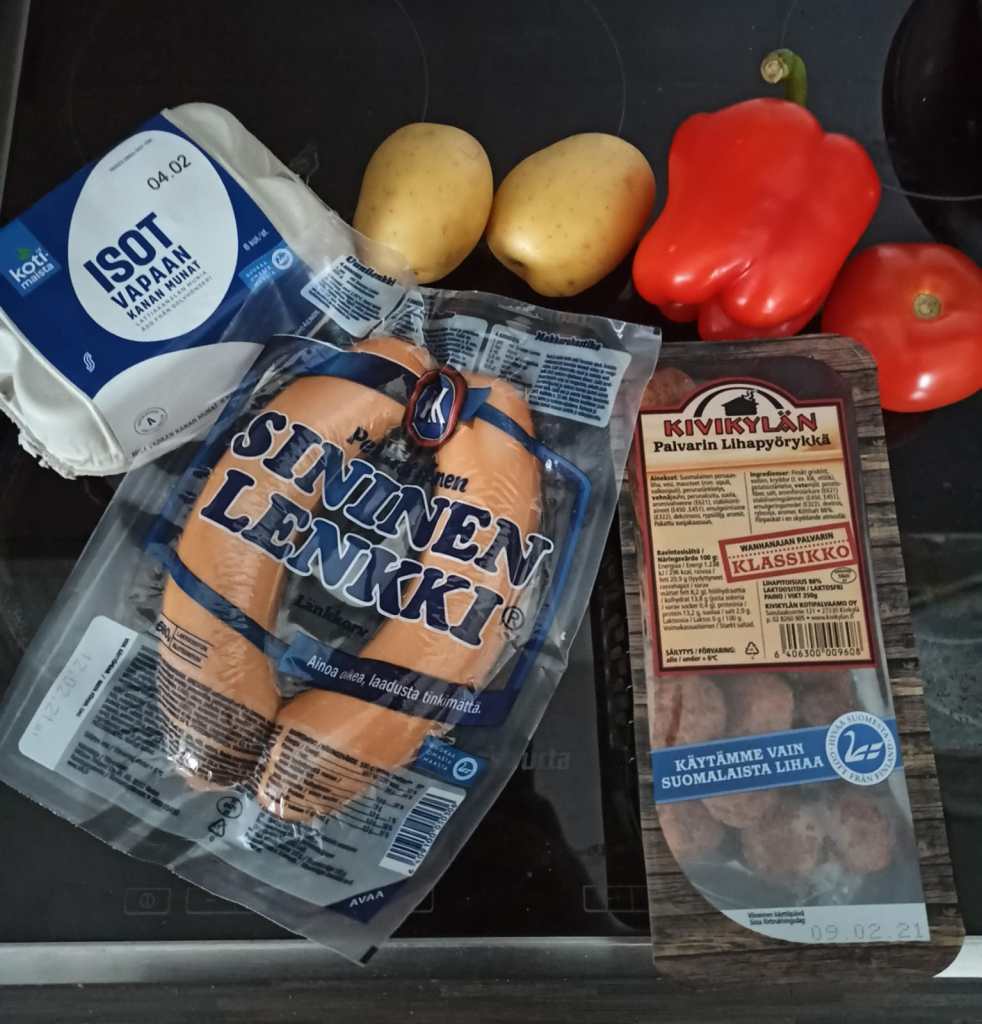 Runeberg tykkäsi nautiskella leivoksia punssin kera. Hän oli sillai herkkusuu. Ajattelin kunnioittaa tätä perinnettä tässä ja aloitin Runebergin päivän punssin kera. Jalluhan on Hampuusin punssi. Jallun myötä aloin miettimään Runebergin nuoruus vuosia Lönnrotin kanssa. Jotenkin näen sisäisten silmieni edessä, ettei sällit hirveästi panostaneet kokkaamiseen, muttei silloin vielä ollut pizzerioita ja kebabbiloitakaan ihan joka nurkalla. Puhtaasti operoidessani mielikuvien varassa näen miten nuori Runeberg on pienessä kankkusessa vääntänyt pyttipannua. Se on helppoa ja siihen voi tunkea periaatteessa mitä vaan. Itseasiassa vanha sananlasku kertoo, että hyvä avioliitto on kuin pyttipannu, vain sen osapuolet tietävät mitä siihen on käytetty. Se voi hyvinkin pitää paikkansa, mutta minä paljastan mitä tulee Runebergin pyttipannuun. Siihen tulee HK:n sinistä, sillä Runeberg ei tyydy halpoihin kopioihin. Kivikylän lihapyöryköitä. Onhan ne markkinoiden parhaat valmispyörykät. Kananmunia ja perunaa, sekä tomaattia ja paprikaa.