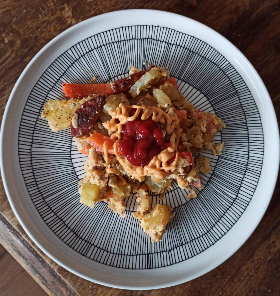 Minulla olisi muistikuva, että Runebergin tortun olisi kehittänyt hänen vaimonsa Fredrika Runeberg, joka leivostentekijän maineen lisäksi oli myös kirjailija, toimittaja sekä naisten oikeuksien puolesta puhuja. Moderni pariskunta siis. Runebergin torttu on vahvasti osa Runebergin päivää. Näimpä lähdin kunnioittamaan Fredrikan luomusta myös pyttipannussani ja koristelin sen samaan tyyliin chilimajoneesilla ja ketsupilla. Näin lopputuloksena oli äärimmäisen hyvä pyttis. Kertakaikkiaan loistava pyttipannu, johon paprika ja tomaatti toi sopivasti raikkautta, maukkaan lihan rinnalle. Tätä olisi kelvannut Runebergin ja Lönnrotinkin syödä pitkien iltojen jälkeen seuraavana päivänä ja taas olisi jaksanut rustailla runoja.