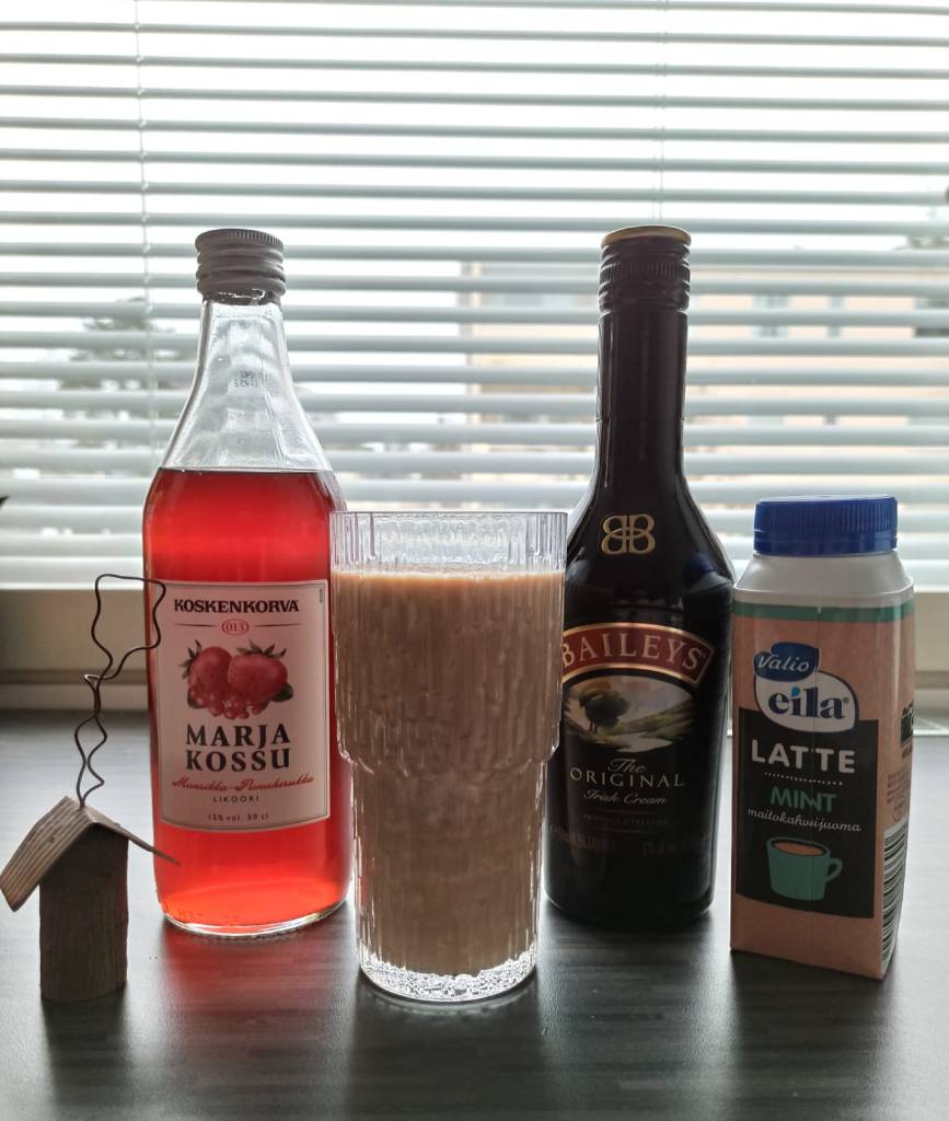 Hyvin ravitsevan pyttipannun päälle jälkiruokana toimii hyvin jälkiruoka drinkki. Itseasiassa mietin, että kun Runeberg oli leivosten ystävä, niin teen drinkin joka on kuin leivos. Näin sitä voi sitten kutsua Runebergin drinkiksi. Minulla ei kuitenkaan ollut kristallin kirkasta visioa mitä siihen tulisi, vaan kauppareissulla toimin vahvasti intuition varassa. Lopulta ostoskoriini ilmestyi Jallua (tietysti), Marjakossua (sitä mansikka-punaherukka versiota), Baileystä (koska miksipä ei) ja Latte mint maitokahvijuomaa. Lopputulos oli kyllä huippuherkullinen. Juuri sellainen kuin hyvän jälkiruuan pitääkin olla. Tällaisen jälkeen runosuoni kukkii taas ihan eri malliin.