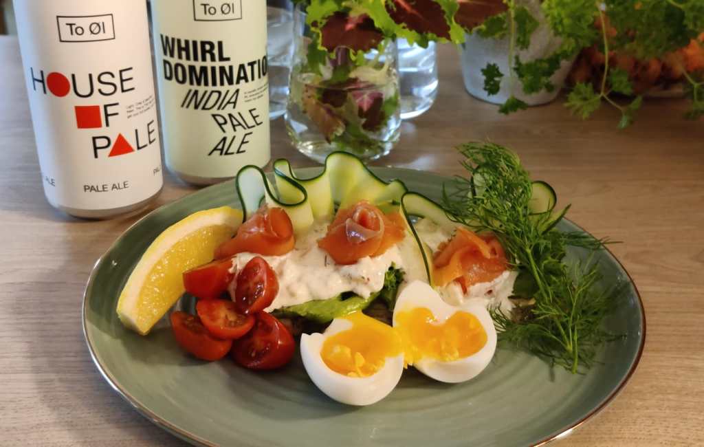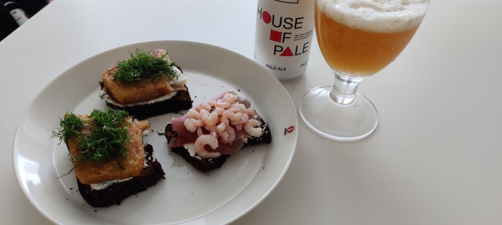 Pohjaleiväksi luonnollisesti saaristolaisleipää, sillä tanskalaiset pitävät tummasta leivästä. Sitten pari erilaista päällisversiota. Paistoin pannulla jonkin lidlistä ostetun kalaleikkeen, jonka alle tilli-sulatejuusto-sekoitusta. Päälle myös vähän tilliä. Toisessa versiossa on pohjalla sulatejuusto, ja päällä kinkkua ja katkarapuja. Ajattelin että smörrebröd on sellainen kylmä ruoka, joten mitenkään kuumana en kalaa tai katkarapuja itselleni tarjoillut. Ruokajuomaksi tanskalainen To Öl House of Pale. Tosi hyvä valinta tälle ruualle.