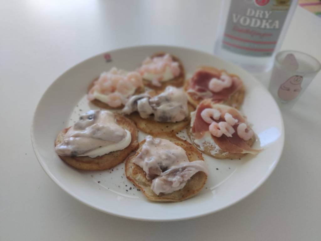 Blinit asettelin lautaselle ja päälle reilusti mustapippuria. Sen jälkeen muutama erilainen täyte. Smetanaa, katkarapuja, kinkkua, tuorejuustoa, rapumarinoitua silliä. Ruokajuomaksi vodkaa Barbapapa-lasista. Mukavia suolaisia lättysiä tämmöset blinit. Ja kun täytteet on aika vapaasti valittavissa niin oikein hyvä eväs tarjoiltavaksi vieraillekin. Ja mikäs sen mukavampaa kuin katsella jalkapalloa ja nauttia pikku suolaista vodkan kera.