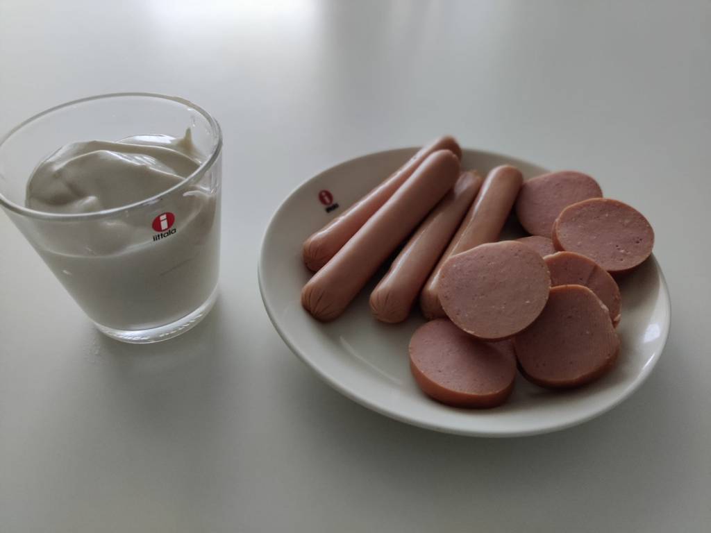 Ja kyllähän lakritsijogurtti tästäkin testistä aivan hyvin selvisi, mutta ei aivan yltänyt makeiden kilpailijoidensa tasolle. Perinteisten jogurttien hedelmäinen raikkaus toimii vain paremmin suolaisten lihatuotteiden kanssa. Mutta kyllä tämä ihan asiansa ajaa, eikä ruokailusta jäänyt millään tavalla huono mieli. Nakkien ja makkaran kanssa 2½/5