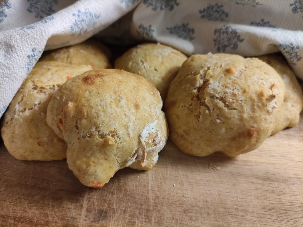 Ai niin, ja olihan mullakin sämpylöitä. Nää sämpylät on nyt tehty sen edellisen porkkanakeiton jämistä. Mä siis siivilöin sen ja se jäljelle jäänyt mössö on nyt näissä. Toimii.