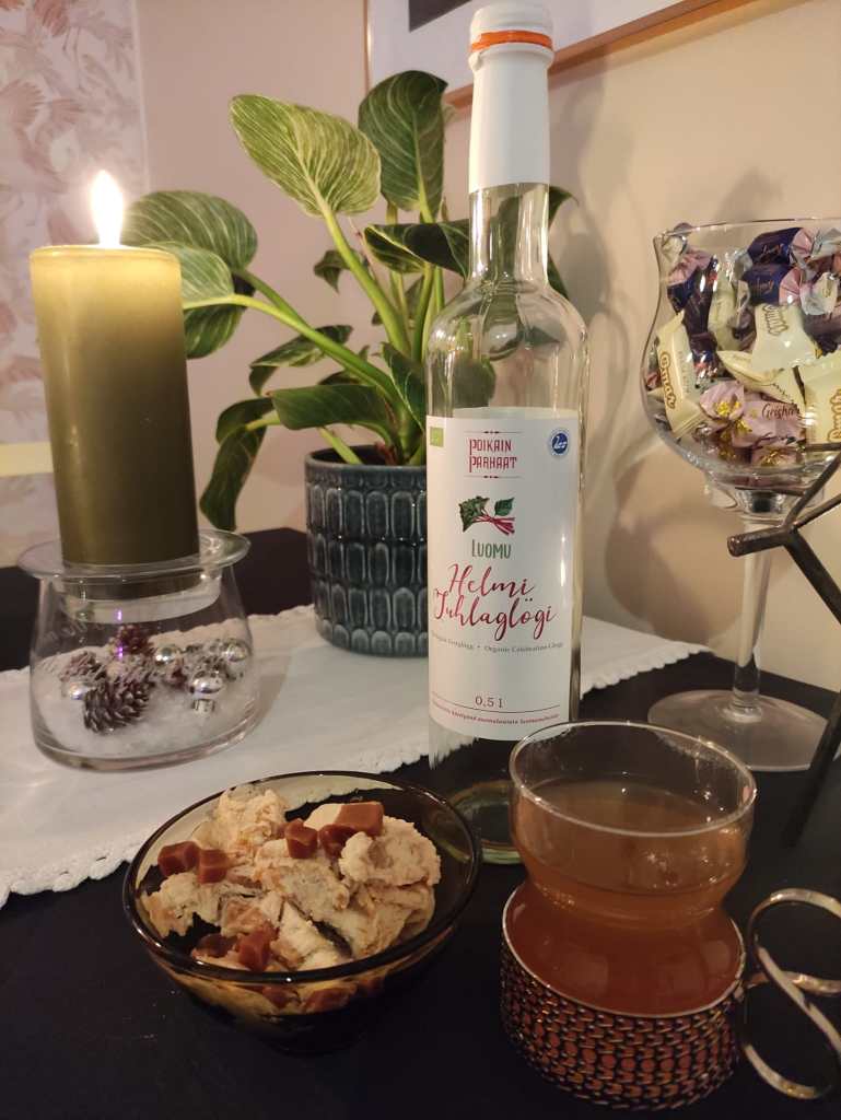 Päätän, että on oikea aika avata vuoden ensimmäinen glögi. Tilanteeseen valikoituu Loimun vuoden 2023 vuosikerta-glögi. Jokaisella vuodella on oma tarinansa, glögillä tällä kertaa kauniimpana kuin minulla. Tämän vuoden tarinasta minä kirjoittaisin lyijykynä painuen paperiin: ”Paskaa!”, vaikka lähemmin tarkasteltuna kaikki on hyvin.