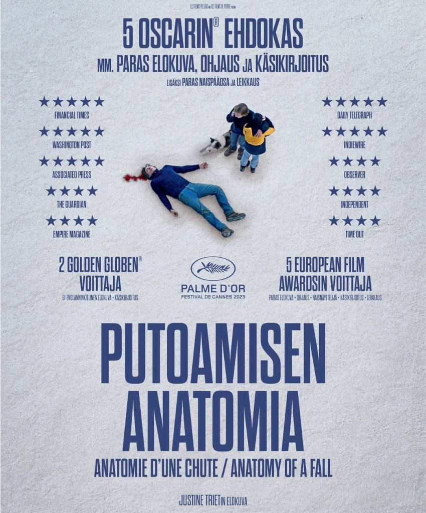 Hampuusi: Meikämetsuri kävi taas leffateatterissa. Tällä kertaa katseluun tuli Putoamisen anatomia (Anatomie d’une chute), joka on Justine Trietin ohjaama ja osittain kirjoittama rikosdraama viime vuodelta, mutta sai meillä ensi-iltansa vasta viime perjantaina. Elokuvassa perheen lähes sokeutunut poika löytää isänsä kuolleena kotipihasta ja vaimosta tulee epäilty. Vaihtoehtoja on kolme: Onnettomuus, murha tai itsemurha. Siinä lähtöasetelmat elokuvaan. Tämä on siis elokuva, joka voitti niin Cannesissa kuin Golden globessa Kaurismäen Kuolleet lehdet.
