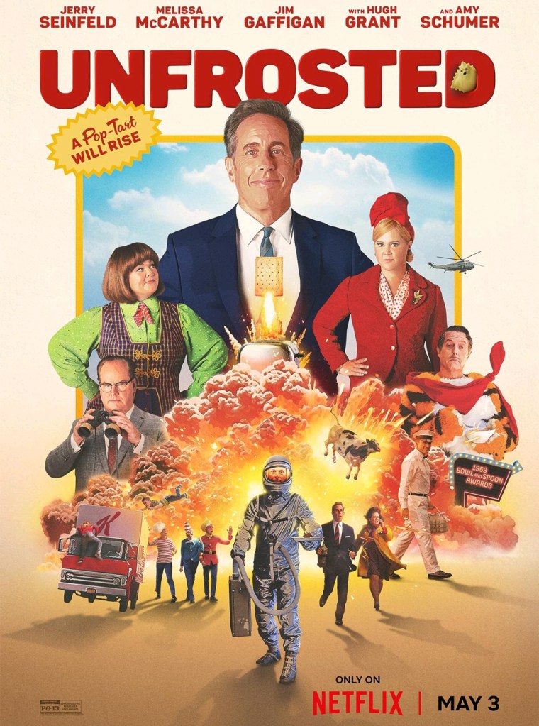 Unfrosted on Netflixin tuore komedia toukokuun ensimmäisiltä päiviltä. Kyseessä on hyvin pitkälti Jerry Seinfeldin elokuva, sillä hän on sekä ohjaaja ja pääosa näyttelijä, mutta myös yksi käsikirjoittajista. Elokuva sijoittuu 60-luvun alkuun ja kertoo Kellogg’sin ja Post yhtiöiden häikäilemättömästä kamppailusta aamiaisbisneksessä. Kellogg’s on vienyt taistelun murobisneksessä, mutta nyt Post on tuomassa markkinoille uuden tyyppisen aamiais-innovaation, niin taistelu markkinajohtajuudesta menee entistä brutaalimmaksi. Siinä tämän hassuttelun lähtöasetelmat.