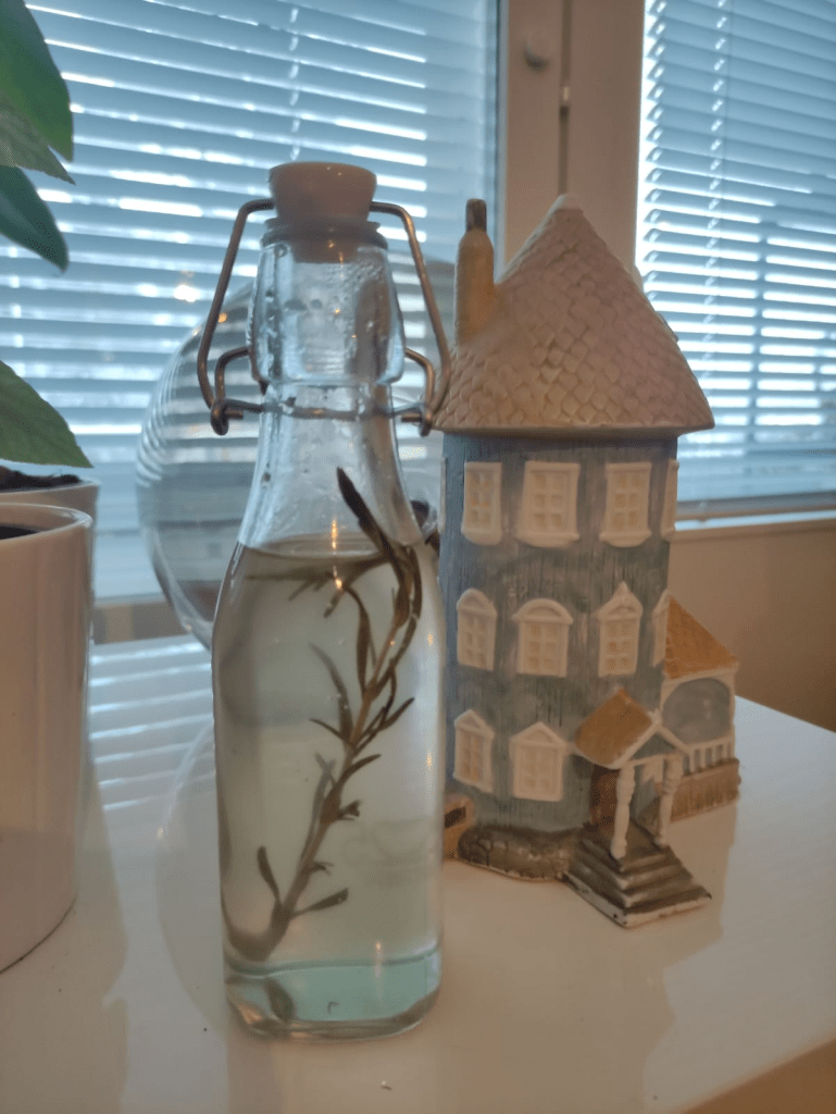 Keitä hiljalleen kattilassa, jotta sokeri liukenee joukkoon. Poista rosmariinit ja kaada puhtaaseen, tiiviiseen astiaan. Säilynee n. pari viikkoa viileässä. Itse kyllä käytän niin kauan, ennen kuin ilmenee maku-/näkö- tai hajuhaittoja.